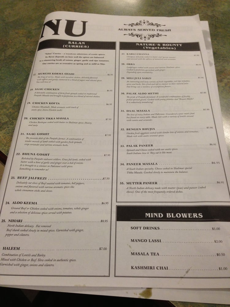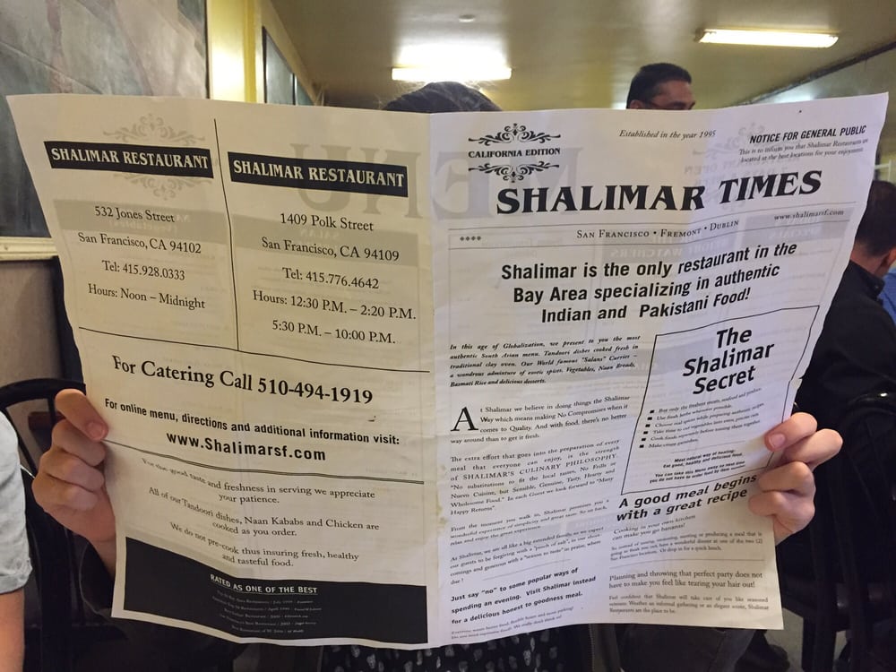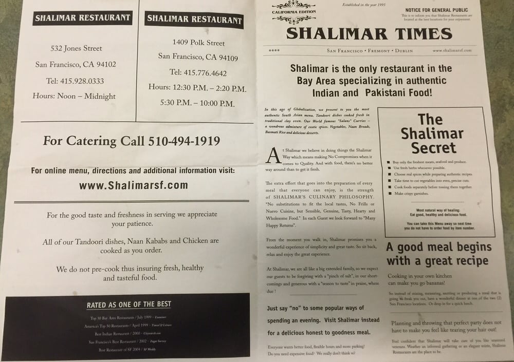 Introducing the menu at Shalimar, a Pakistani-Halal-Indian restaurant located in San Francisco, CA, offering a variety of vegan and vegetarian options. Specializing in traditional dishes such as Palak Paneer, Daal Masala, and Paneer Masala, Shalimar delivers a truly authentic dining experience. The flavorful Kabli Channa and Bengen Bhujia are also must-try dishes on the menu. Customers rave about the soft and fluffy naan, perfect for dipping into the rich curry sauces. The menu also includes refreshing beverages like Mango Lassi. With options for reservations, delivery, and catering, Shalimar is a top choice for groups and families. The inviting atmosphere, attentive service, and delectable flavors make Shalimar a standout in the Bay Area dining scene.