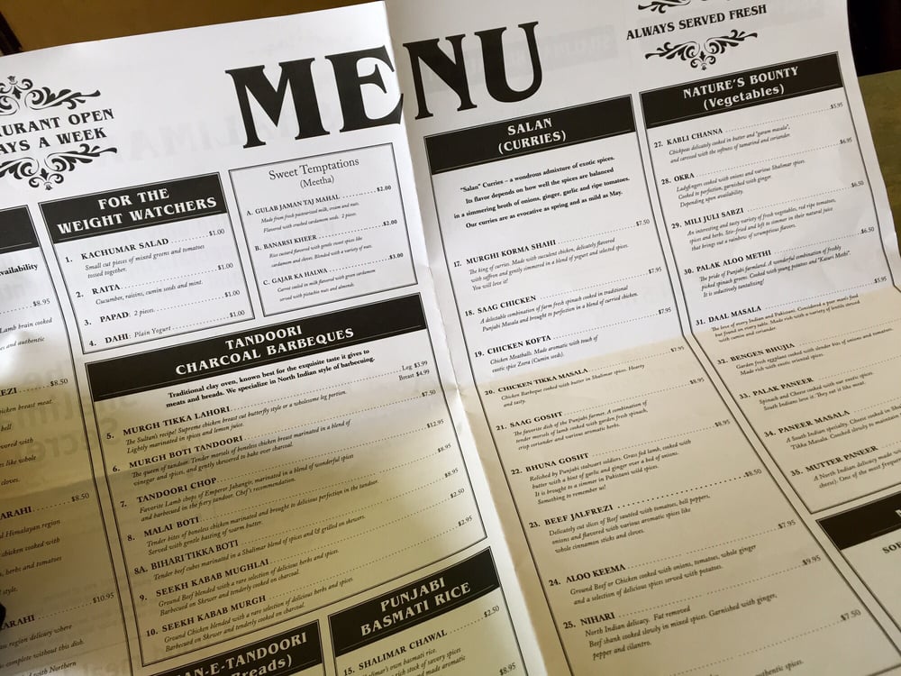 Shalimar Menu (Update 2025)